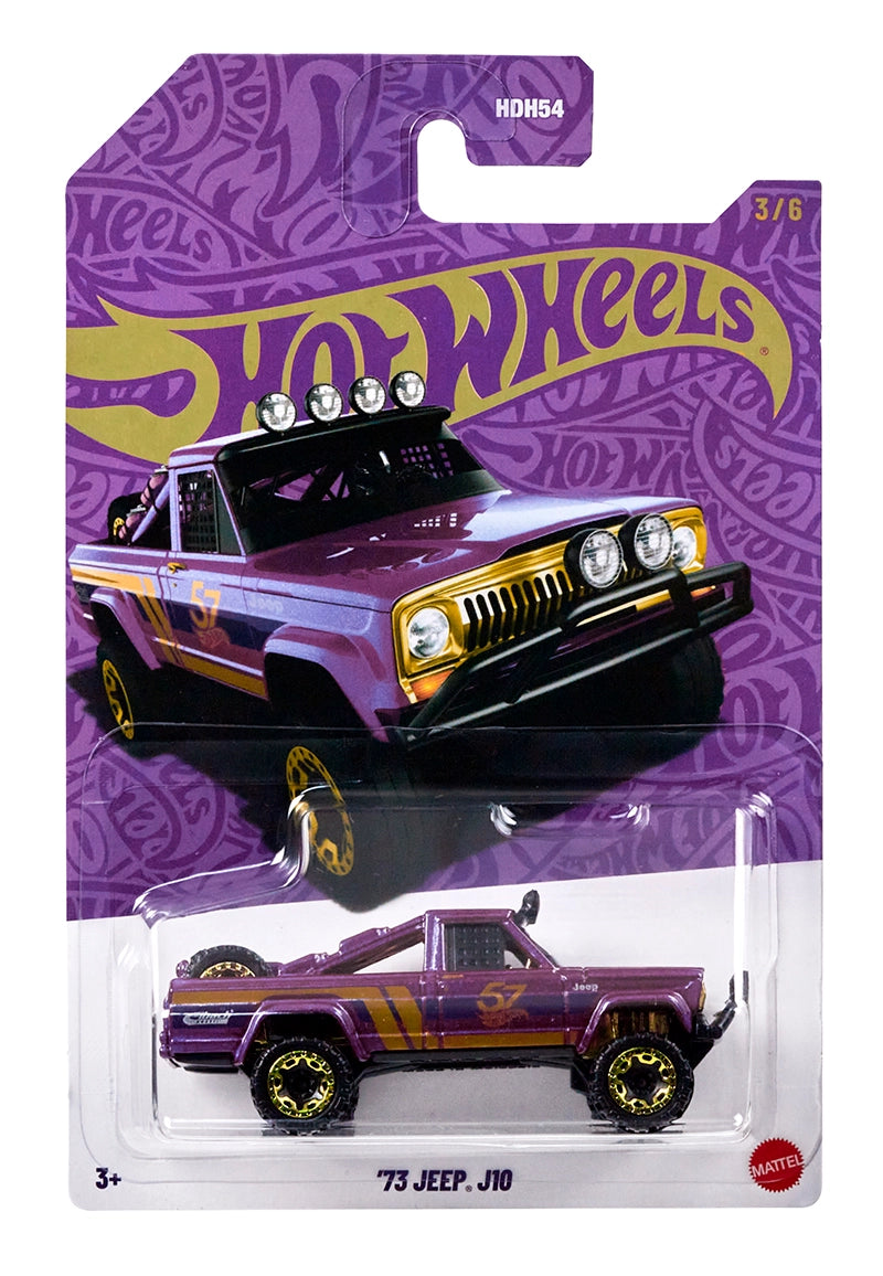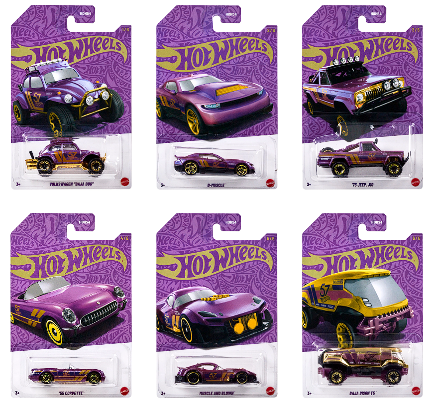 Hot Wheels has been challenging the limits since 1968, passionately creating the coolest and craziest toy cars and tracks for non-stop fun. To celebrate this 57th anniversary, it's releasing a collection of die-cast cars, trucks and vans with commemorative purple- and gold-colored deco. Each of these race-ready vehicles is 1:64 scale, and there are modern and vintage castings of popular automobiles available - kids and collectors can choose a favorite or get them all. The anniversary-themed packaging enhances collectability and makes it prime for display. Each vehicle sold separately, subject to availability. Styles, colors and decorations may vary.