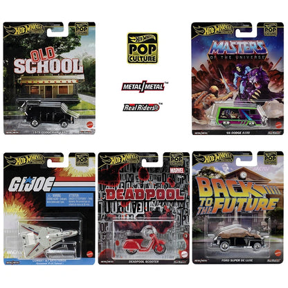 Hot Wheels brings pop culture nostalgia to life with the Premium Pop Culture 2023 Mix 3J! This set features iconic vehicles from legendary franchises, each crafted with premium details, diecast metal bodies, and Real Riders rubber tires for ultimate authenticity.